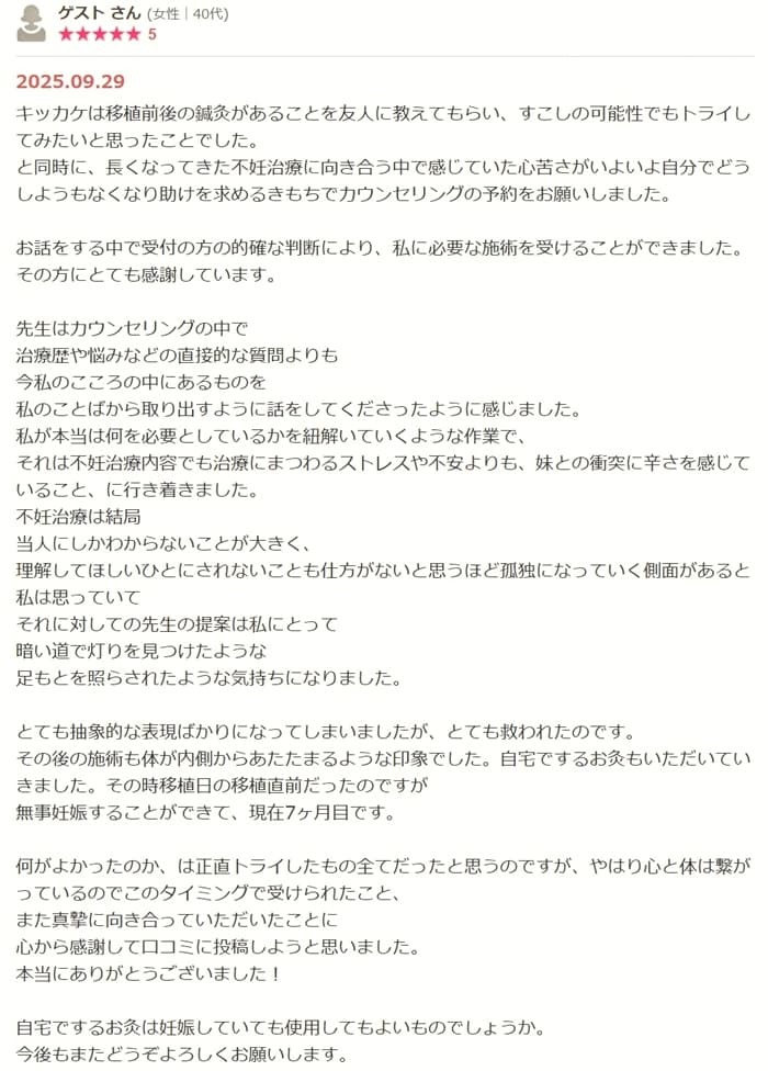 ご希望に合わせ、移植前と後の鍼灸を行います(KLC、SACの半数、全体で30%ほどの方が受けられています)。